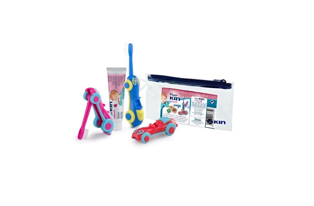 Lõbus reisikomplekt pisematele lastele sisaldab autokujulist ümara harjapeaga hambaharja ja 25 ml FluorKIN hambapastat.