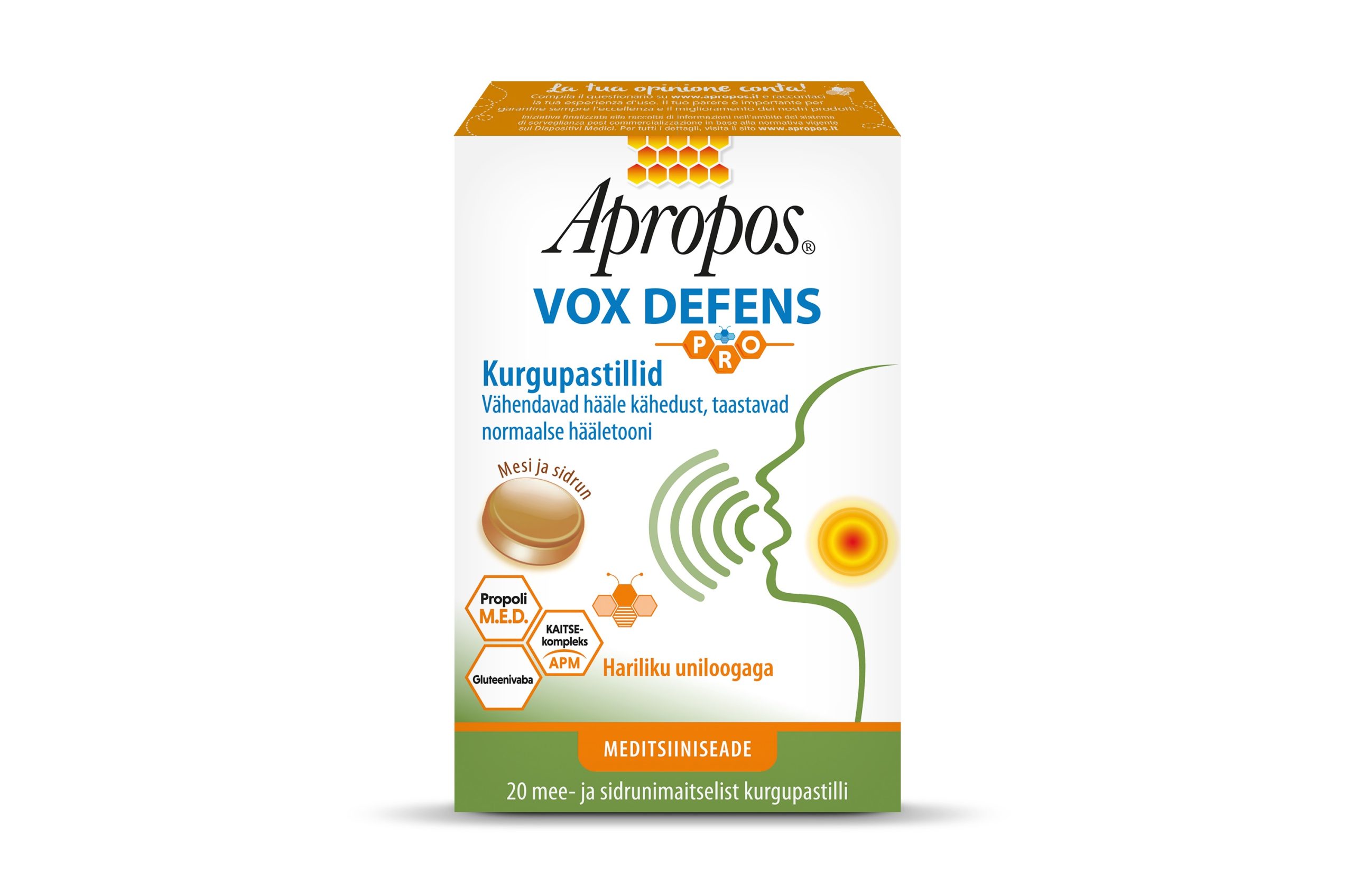 Apropos Vox Defens PRO on meditsiiniseade, mis on mõeldud spetsiaalselt hääle käheduse vähendamiseks hääletooni muutumise või kadumise korral. Tänu „mukoadhesiivsetest polümeersetest aktiivainetest“ koosnevale APM kaitsekompleksile loob see suuneelu limaskestale kaitsva kaitsekile, mis kaitseb seda ala kahjulike väliste tegurite eest ja võimaldab pastillis sisalduvatel toimeainetel jääda limaskestaga kauem kokkupuutesse.