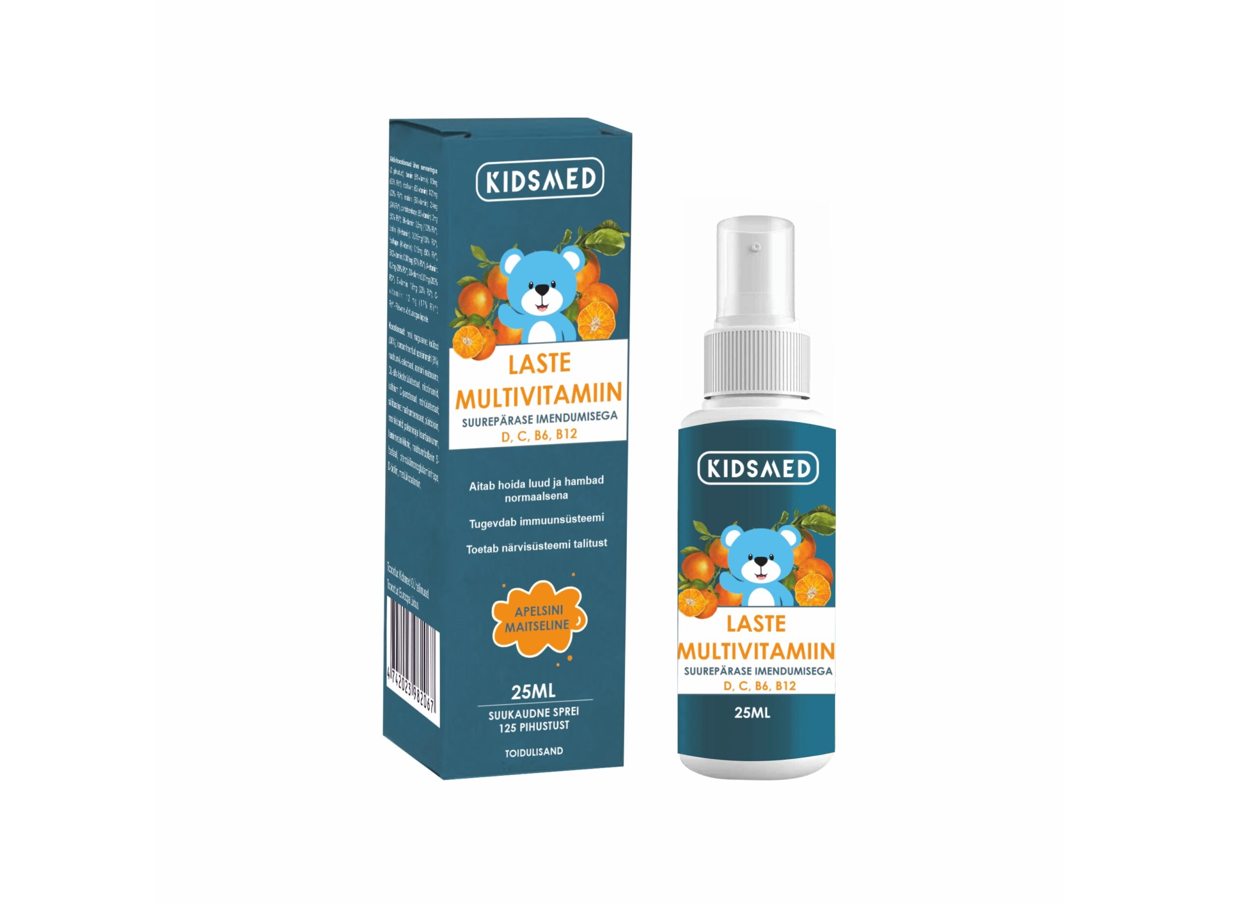 Kidsmedi multivitamiin on lihtsasti kasutatav toidulisand suusprei kujul. See sisaldab kohandatud vitamiinide kombinatsiooni lastele. Multivitamiin sisaldab D-vitamiini, mis on vajalik luude normaalseks kasvuks ja tugevdamiseks. Lisaks sisaldab vitamiine C, B6, B12 ja folaate, mis aitavad kaasa immuunsüsteemi normaalsele talitusele. Apelsini maitseline. Magustatud ksülitooliga, mida leidub looduslikult erinevates puuviljades. Sobilik alates kolmandast eluaastast!