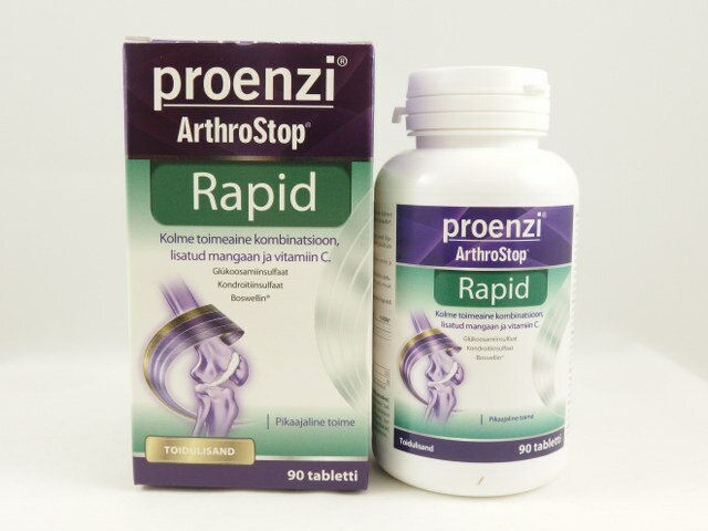 Proenzi ® ArthroStop® RAPID sisaldab kombinatsiooni kolmest toimeainest: glükoosamiinsulfaat, kondroitiinsulfaat ja Boswellin®, rikastatud mangaani ja vitamiin C-ga. Glükoosamiinsulfaat ja kondroitiinsulfaat on elementaarsed liigesekõhrede ning muude sidekudede – luude, sidemete ja kõõluste – olulised ehitusmaterjalid. Boswellin® (Boswellia serrata ekstrakt) on abiks liigeste tervise ja painduvuse tagamisel.Mangaan aitab normaalsete luude eest hoolitseda ja toetab sidekudede teket. Vitamiin C toetab normaalset kollageeni teket, mis on vajalik luude ja kõhrede normaalseks toimimiseks. Toode ei sobi alla 12-aastastele lastele ja rasedatele naistele.