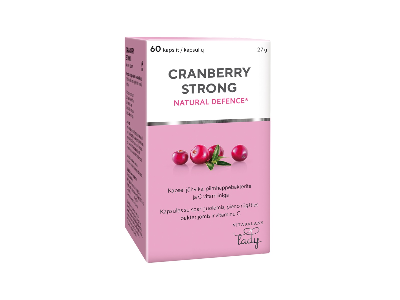 Tugevat jõhvikaekstrakti sisaldav Cranberry Strong sisaldab standardset kogust jõhvika bioaktiivseid PAC -sid annuses 72 mg päevas. Kapsel sisaldab ka palju C -vitamiini, et soodustada organismi enda vastupanuvõime normaalset toimimist. Cranberry Strong Natural Defense sisaldab nelja erinevat piimhappebakteritüve, mis on tüüpilised intiimpiirkonna mikrobiootale (Lactobacillus acidophilus, Lactobacillus casei, Lactobacillus rhamnosus, Bifidobacterium longum). Bakterid on kaitstud maohappesuse eest spetsiaalse tehnoloogiaga, mis tagab bakterite ellujäämise ja hea elujõulisuse seedetrakti läbimisel.