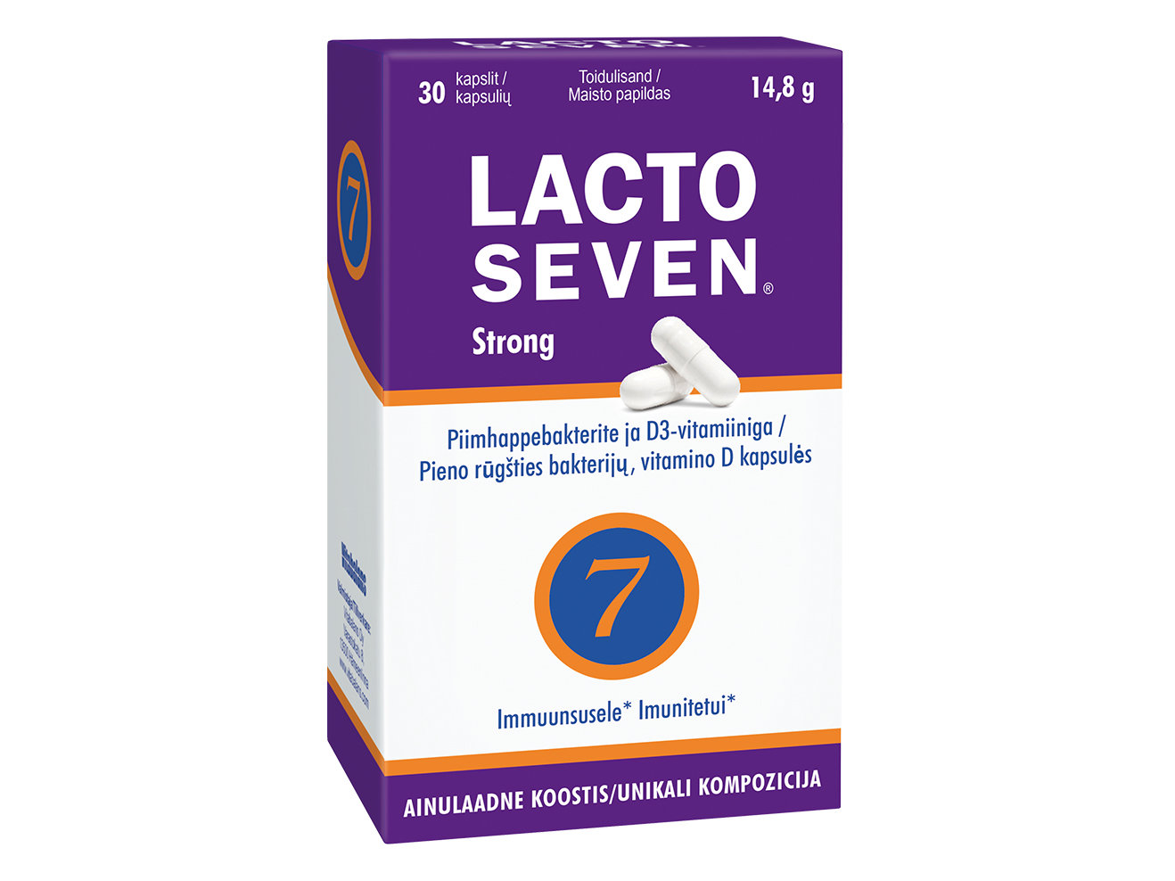 LACTO SEVEN Strong kapslid sisaldavad kokku 10 miljardit piimhappebakterit, seitsmest erinevast piimhapebakteri tüvest (sh Lactobacillus ja Bifidobacterium tüved). Kapsel sisaldab ka D3 vitamiini, mis tugevdab vastupanuvõimet.