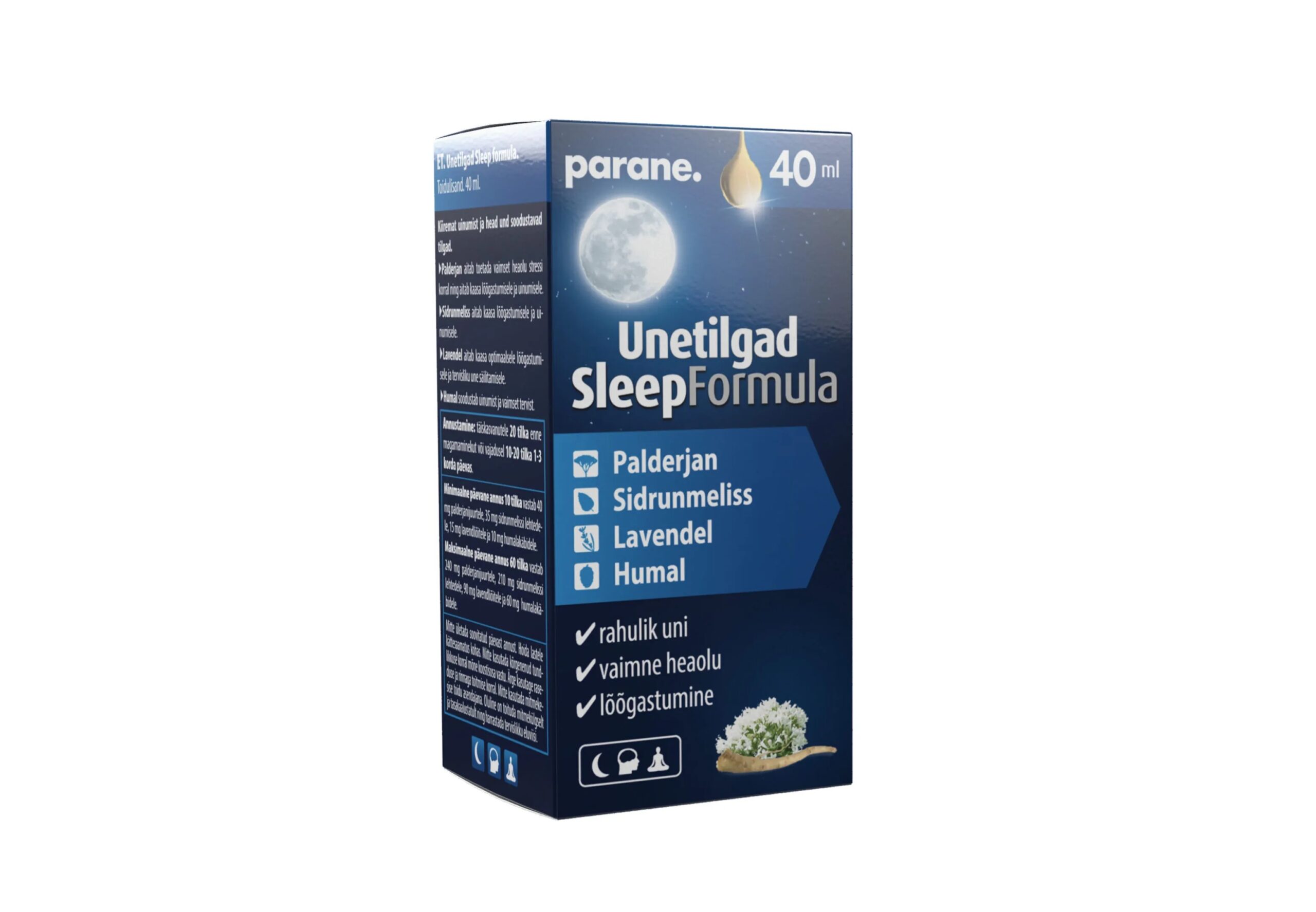 Maksimaalne päevane annus (60 tilka) vastab 240 mg palderjanijuurtele, 210 mg melissilehtedele, 90 mg lavendliõitele ja 60 mg humalakäbidele.